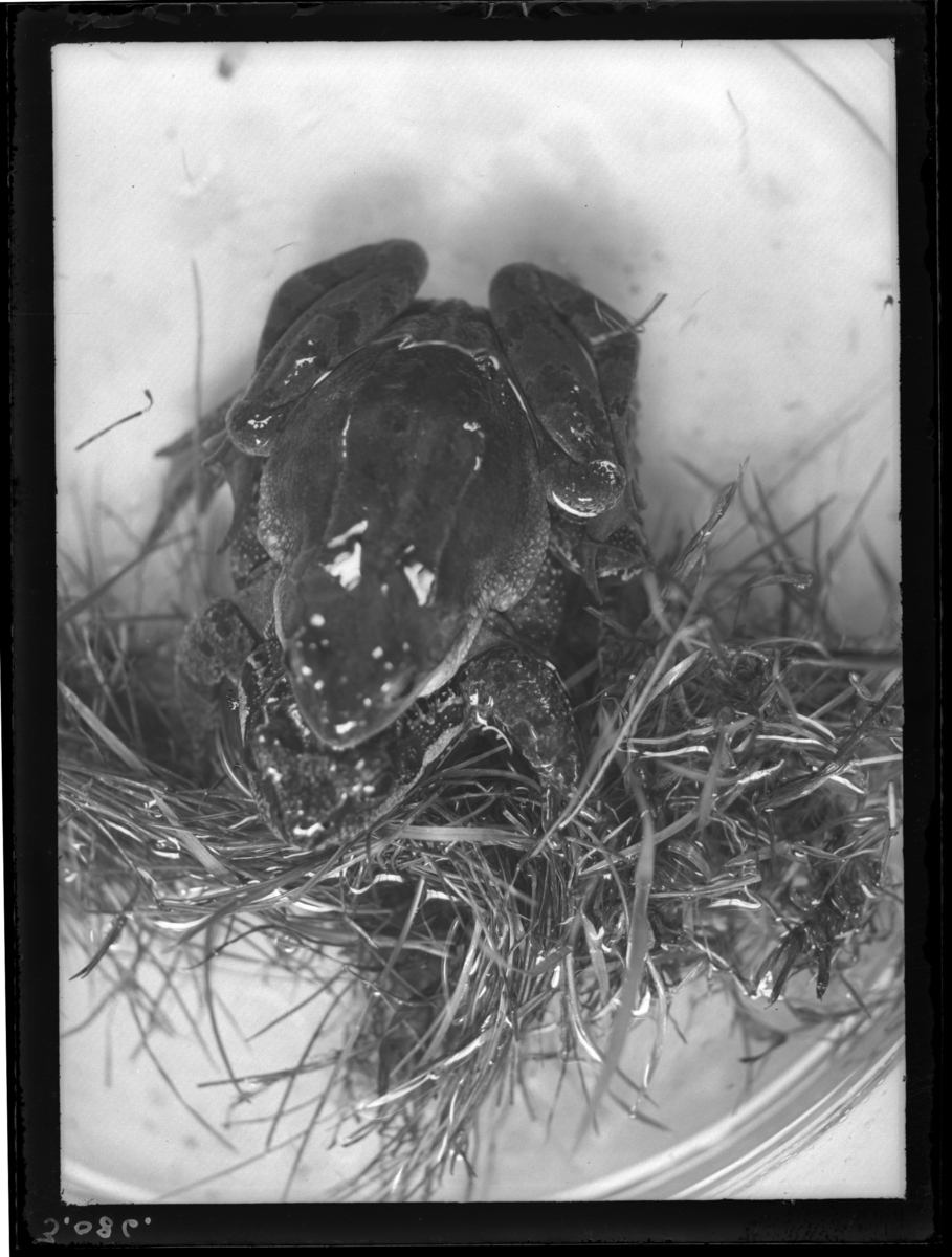 'Vanlig groda under parning i labb. Sedda framifrån. :: :: Se serie med fotonr. 3082-3090.'