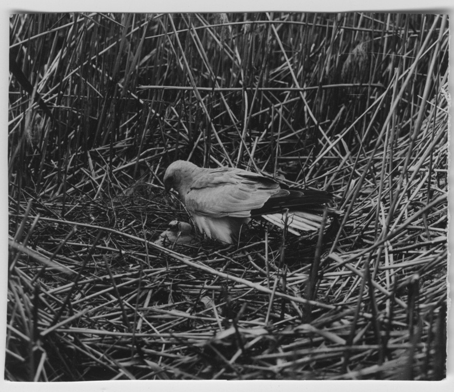 'Blå kärrhök, hane, vid boet med ungar, i vass. :: :: Se serie med fotonr. 3233-3239.'