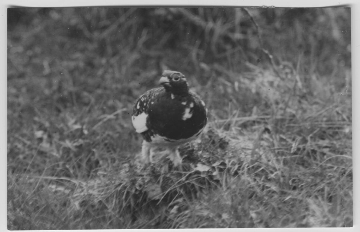 'Riptupp, närbild. :: :: Text på baksidan av fotot ''Den tappra fågeln flög inte bara mot fotografen så vingarna stöks mot hans rockärm. T.o.m. en betande häst rymde fältet när ripan flög emot honom. Honan med de små ungarna låg i gräset nära intill.'' :: :: Se serie med fotonr. 3151-3200, se särskilt fotonr. 3181. Se även fotonr. 1771-1837.'
