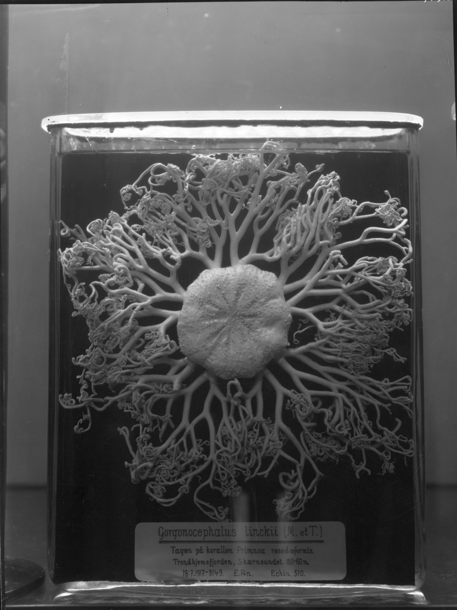 'Ormstjärna, preparat i glasbehållare. :: Fynddatum: 1917-07-18. Gen.kat.nr. 1917-3149. :: :: :: Ingår i serie med fotonr. 2735-2769.'