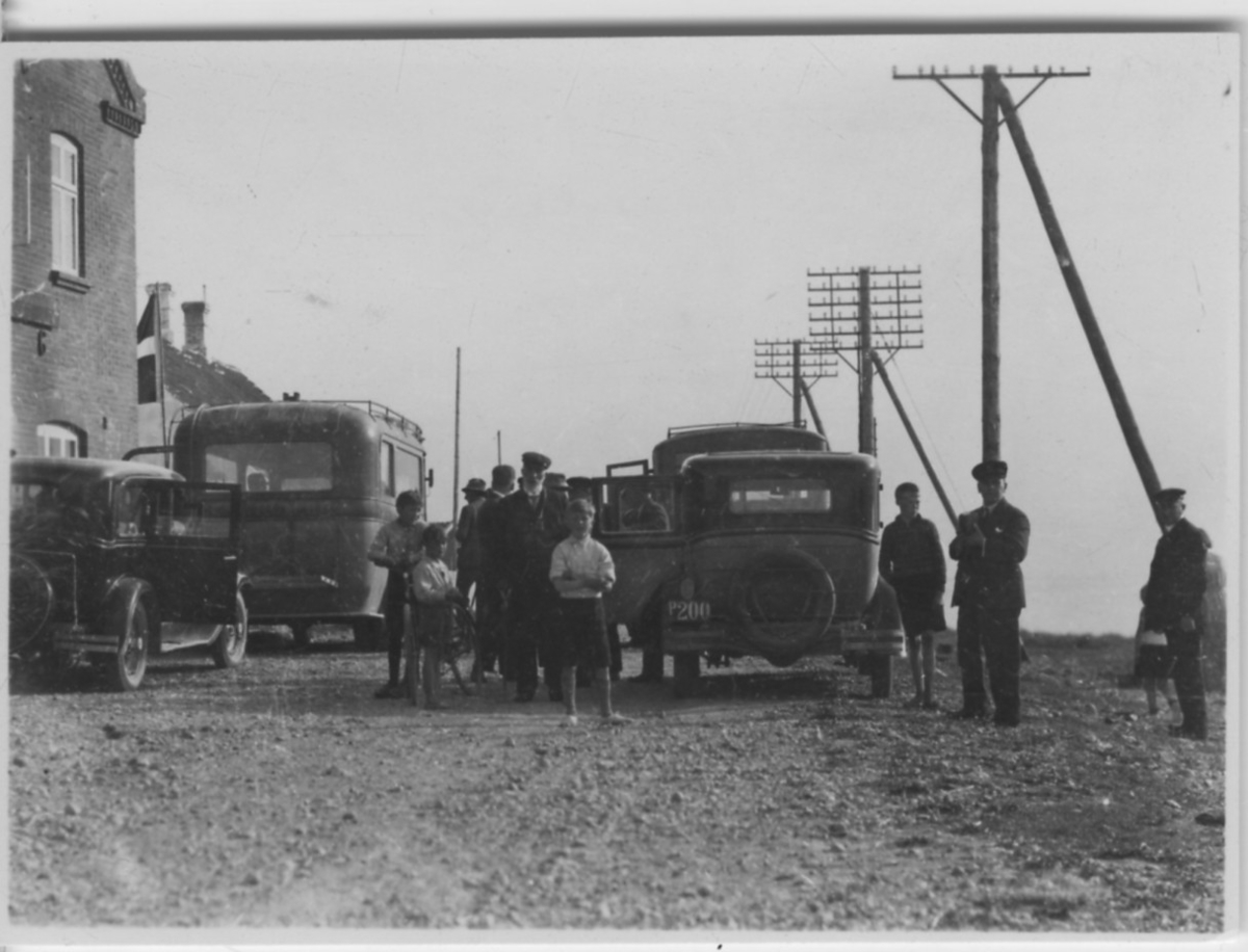 'Biologiska föreningens utfärd till Läsö och Nordre Rönner: :: :: ''Från Läsö.'' 2 st bilar och 2 st bussar samt ca 10 st män och pojkar däribland minst 4 st pojkar, samlade framför fordonen. :: :: Se fotonr. 2674-2734, 2687-2691, 2692-2711, 2714-2734, 2843-2863 och 2975 från samma utfärd.'