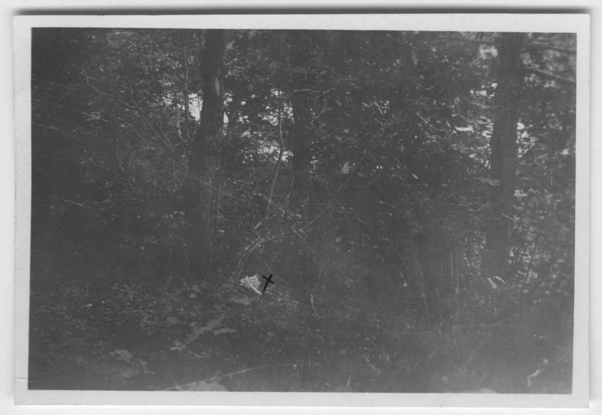 'Platsen för hasselmusboet med 6 st ungar, markerat med ett kryss, i skog. Fynddatum: 1931-08-17. :: :: Se även fotonr. 2961.'