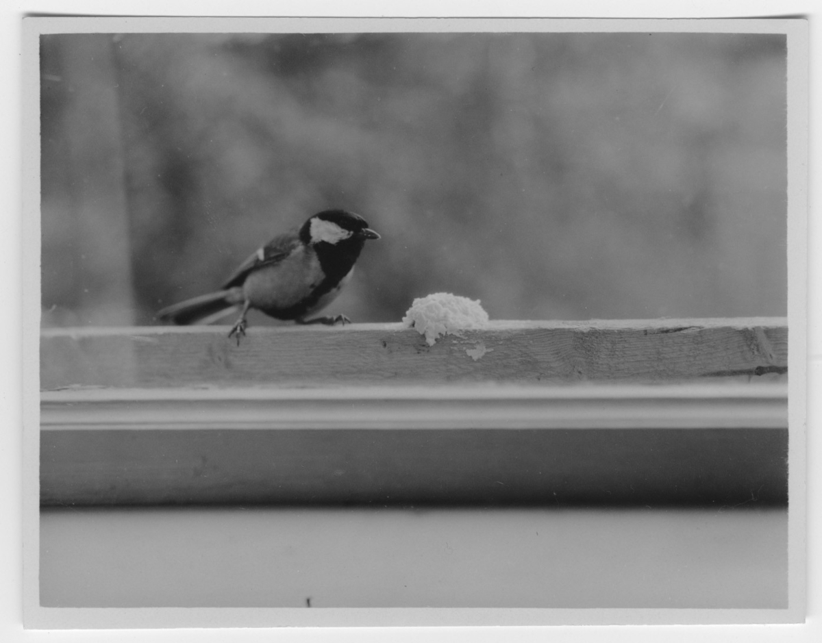 'Talgoxe sittande på träkant vid en bit bröd eller dylikt. :: :: Se även fotonr. 2116.'