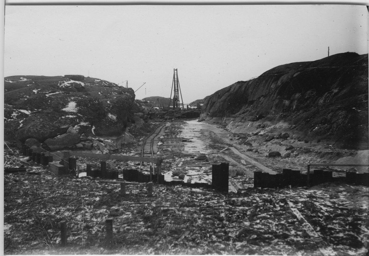 'Från grävningarna i Sotenkanalen: platsen för de fossila benfynden. :: :: Vy över grävplatsen med maskiner, redskap. :: :: Serie fotonr 2773-2778, bilderna är monterade på papper som har utförlig text, se fotonr. 2774:2. :: Samma motiv som fotonr. 2773, se detta nr för mer bildtext..'