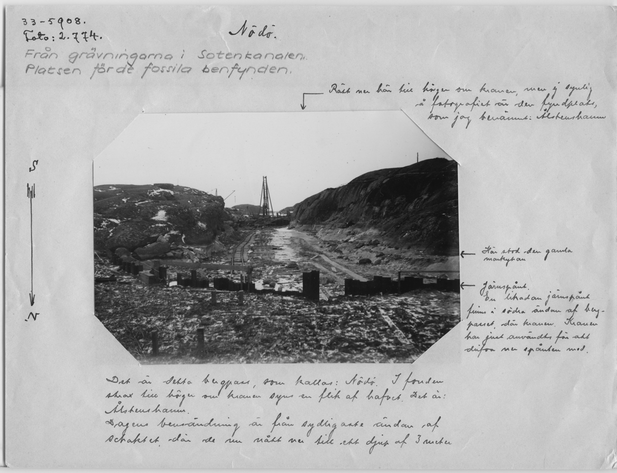 'Från grävningarna i Sotenkanalen: platsen för de fossila benfynden. :: :: Vy över grävplatsen med maskiner, redskap. Bildtext: ''Det är detta bergpass som kallas Nödö. I fonden strax till höger om kranen syns en flik av havet. Det är Ålstenshamn. D(r)agens bensändning är från sydligaste änden av schaktet där de nu nått ner till ett djup av 3 meter.'' Markering av ''Gamla markytan''. :: ''Järnspåpnt, en likadan finns i södra änden av bergpasset, där kranen står. Den har använts för att driva ner de långa järnbalkar varav spånten bestå.'' :: :: Serie fotonr 2773-2778, bilderna är monterade på papper som har utförlig text. Samma motiv som fotonr. 2773.'