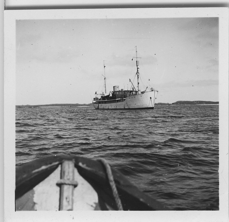 'Från ''Skageraks''-expeditionen till Hebriderna och Shetland: :: :: Skagerak till havs, fotograferad från annan båt med den sist nämndes för synlig i förgrunden. Enligt anteckning på baksidan av fotografiet: Skagerak i Baltasound. :: :: Ingår i serie med fotonr. 4111:1-43.'
