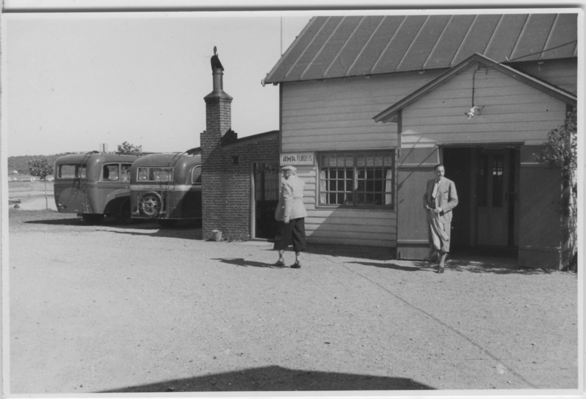 'Biologiska föreningens utfärd till Nordjylland: Sebbersund Kro: :: :: 2 bussar parkerade bredvid byggnad. På en skylt på huset står ''AMA flöde-is. Utanför byggnaden står 2 män. :: :: Ingår i serie med fotonr. 3824-3859.'