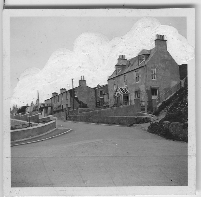 'Från ''Skageraks''-expeditionen till Hebriderna och Shetland: :: :: Stadsvy med ett antal hus längs med en gata. På baksidan står ''Scalloway - fordom huvudstad i Shetland''. På fotografiet är himlen bakom byggnaderna maskad. :: :: Ingår i serie med fotonr. 4111:1-43.'