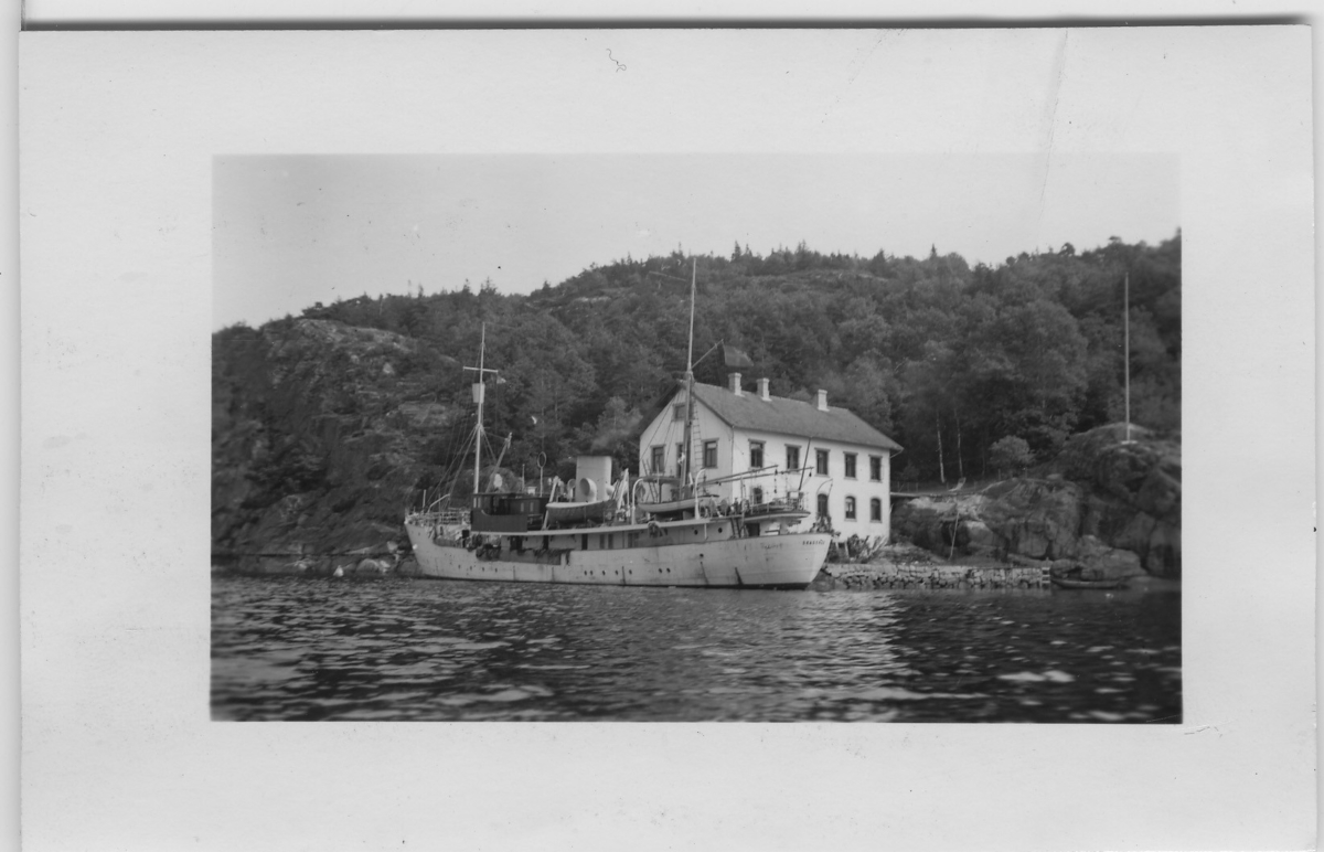 'Undersökningsfartyget ''Skagerak'' utanför Bornö hydrografiska fältstation. :: Ett vykort med texten ''Broder! Sänder dig här avskrift av mitt förslag till Oceangrafavdelning som skall handläggas vid styrelsemötet idag. Hoppas du känna dig kunna back med up ifråga om ?! God jul och gott nytt år önskas Din maka och Dig av vännerna Hans och Dagma Petterson.'