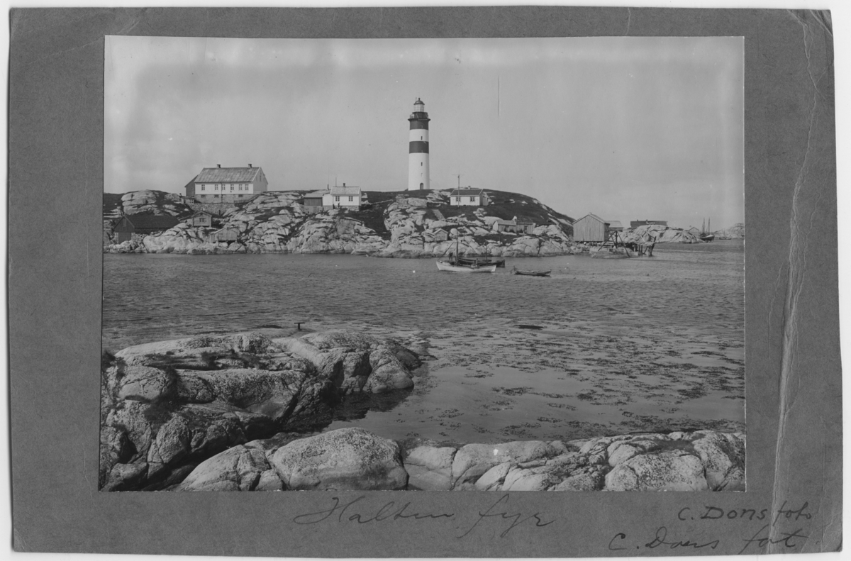 'Vy med haltens fyr på klippa samt hus och träskjul. I havet framför ca 2 mindre båtar. I förgrunden skär. :: :: Ingår i serie med fotonr. 3694-3719 se även fotonr. 3679-3693.'