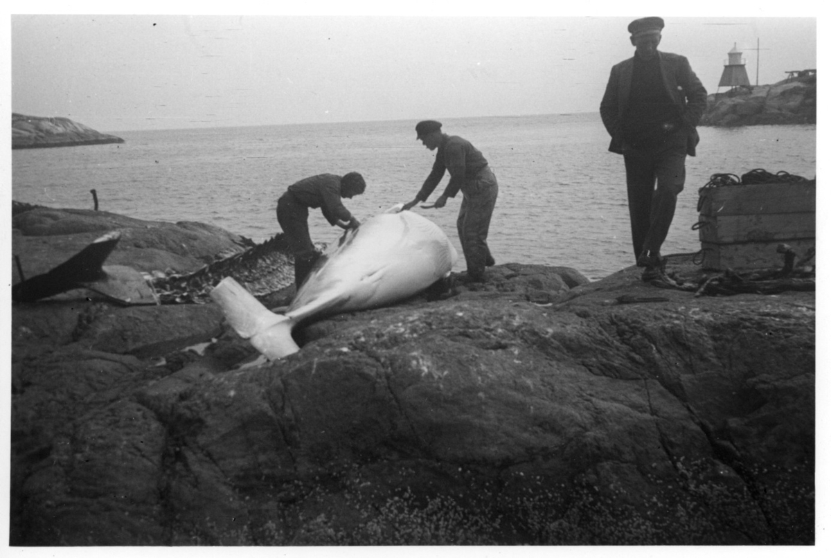 '3 män vid 1 vikval på berghäll med havet i fonden. 2 av männen arbetar med vikvalen, resterna av ytterligare val ligger bredvid dem på klipporna. På andra sidan vattnet syns fyrliknande byggnation. :: :: Ingår i serie med fotonr. 3679-3693 se även 3694-3719.'