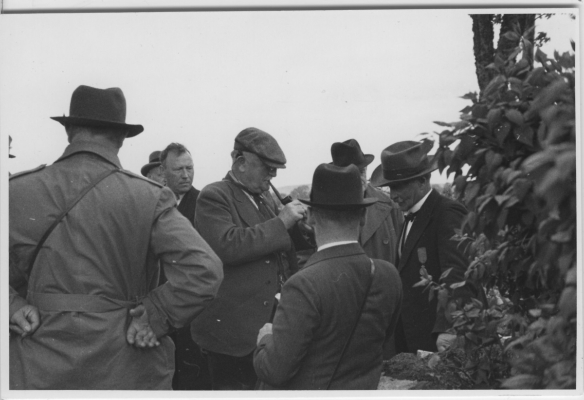 'Biologiska föreningens utfärd till Tåkern, Vadstena m.fl. platser: :: :: 6 män står runt Leonard Axel Jägerskiöld (med pipa) vid runstenen ''Rökstenen'' söder om sjön Tåkern. Se även fotonr. 3613. :: :: Se fotonr. 3588-3634 samt 3661-3677.'