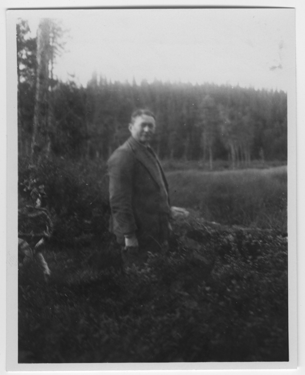 Timrad fångstgrop (otydlig). En man står bredvid fångsgropen i kanten mellan skog och öppet fält.