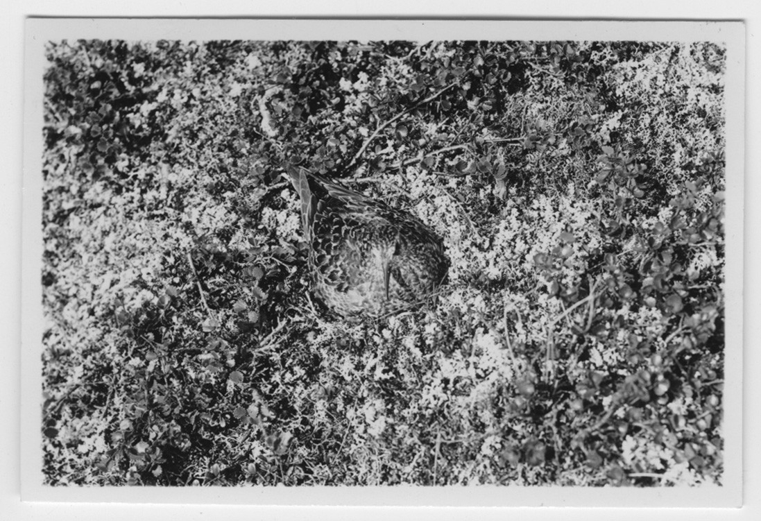 Skärsnäppa på boet, på lav- och risklädd mark.