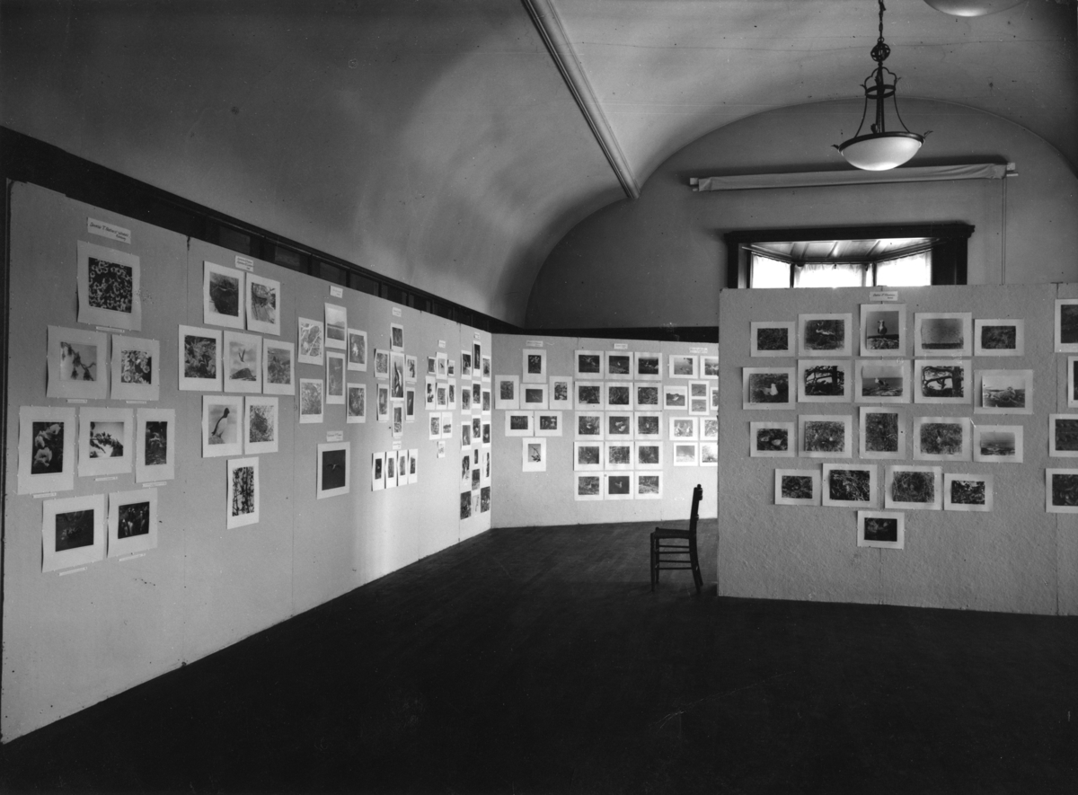 'Utställning av naturfotografier på Naturhistoriska museet, i nuvarande biblioteket. :: Utställningsskärmar med uppsatta fotografier. Taklampa. :: :: Se även fotonr. 4304:2.'