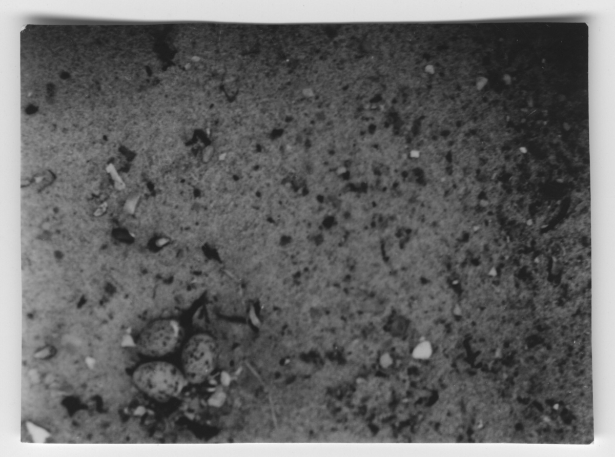 'Småtärna, bo med 3 ägg, på en sandrevel. :: :: Ingår i serie med fotonr. 4293-4301.'