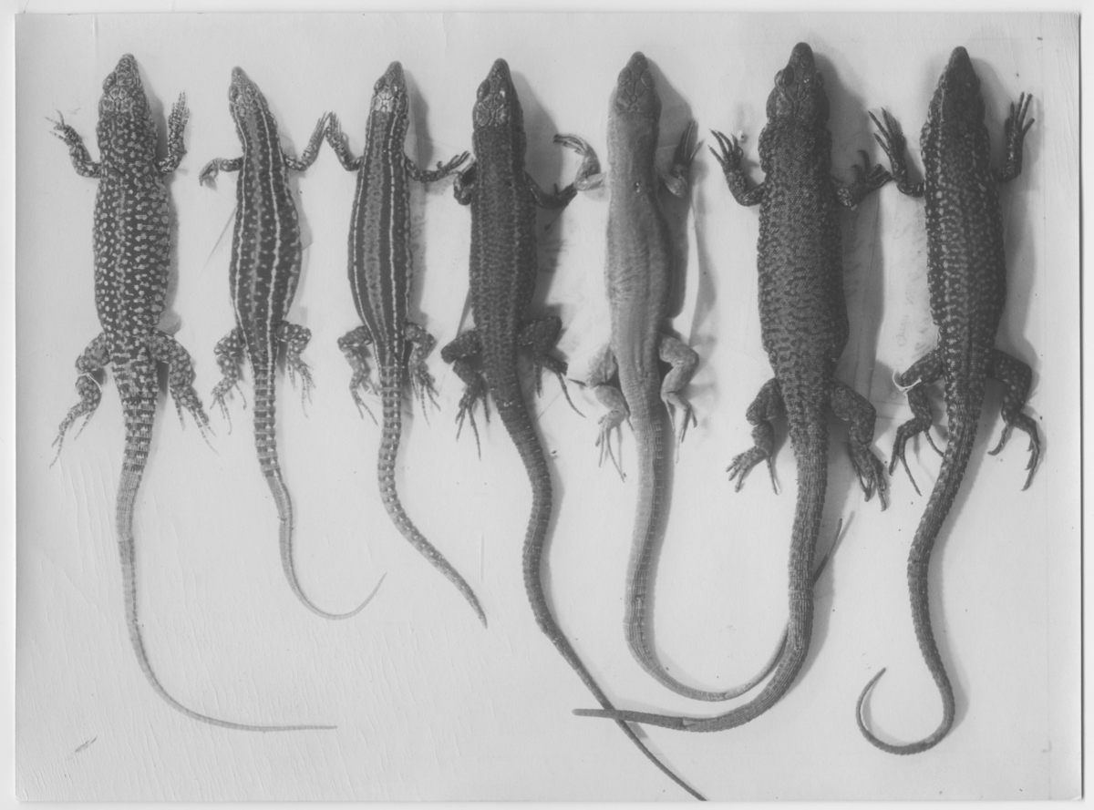 '7 st ödlor sedda från ryggsidan. :: :: Fotonr 4505:1-9: Fotografier över diverse ödlor ur Ingenjör Otto Cyréns ''Spanische und portugiesische Mauereidechsen''. Meddelande från Göteborgs Museum Zoo.46 + 2 teckningar.'