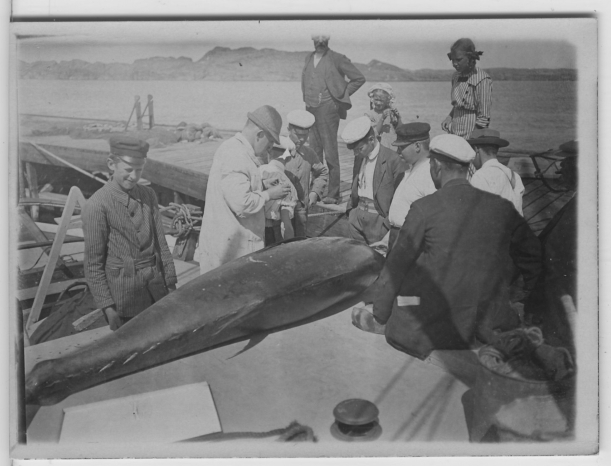 'Biologiska föreningens utfärd till Kristineberg: :: :: En tonfisk upplagd på kajen.7 män, 2 flickor samt 2 pojkar vid fisken. Keps. :: :: Ingår i serie med fotonr. 4242:1-14.'