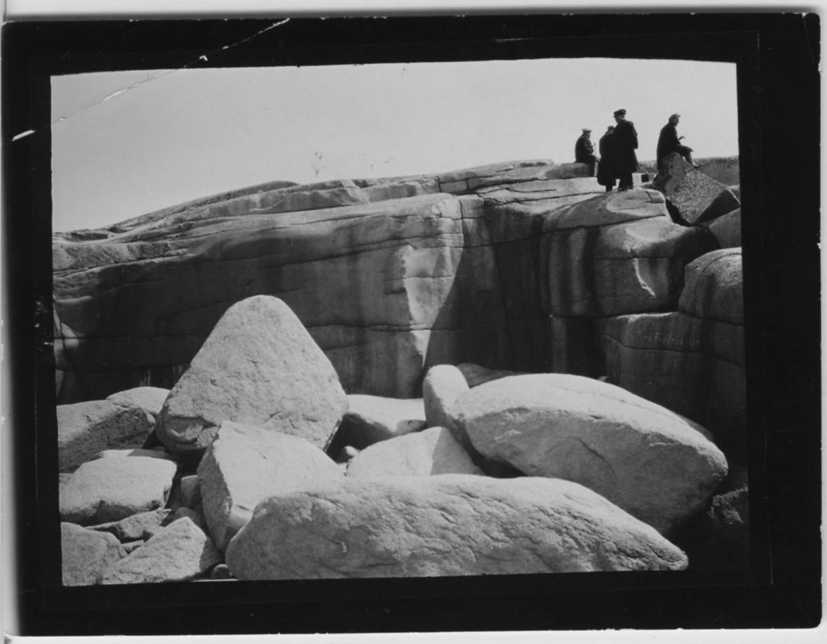 'Biologiska föreningens utfärd till Kristineberg: :: :: På baksidan står med svag text ''Jägerskiöld''. 4 män uppe på kal berghäll. På en bergväggs sida står skrivet ...Fredriksson. :: :: Ingår i serie med fotonr. 4242:1-14.'