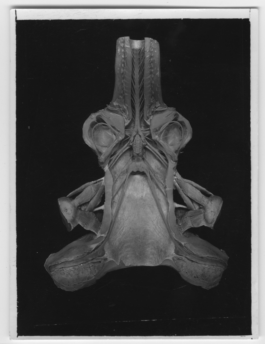 'Hjärna och främre del av ryggmärg samt lukt, syn- och labyrintorgan, hos slätrocka. :: :: Ingår i serie med fotonr. 4177-4184.'