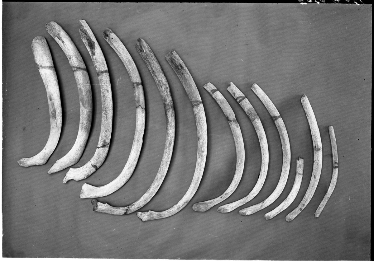 'Höger sidas revben och revbensfragment av swedenborgsvalen. Tvååkersfyndet. (tillhörande Zoologiska Institutionen i Uppsala). :: :: Bildtext enligt årstrycket: ''Höger sidas revben och revbensfragment av swedenborgsvalen, Två-åkersfyndet, sedda utifrån, sjunde revbenet saknas.'' :: :: Bilden med i artikel ''Grönlandsvalen från Guldheden och Swedenborgsvalen från Landerigatan'' av Orvar Nybelin i Göteborgs Naturhistoriska Museums Årstryck 1946 s. 108.'