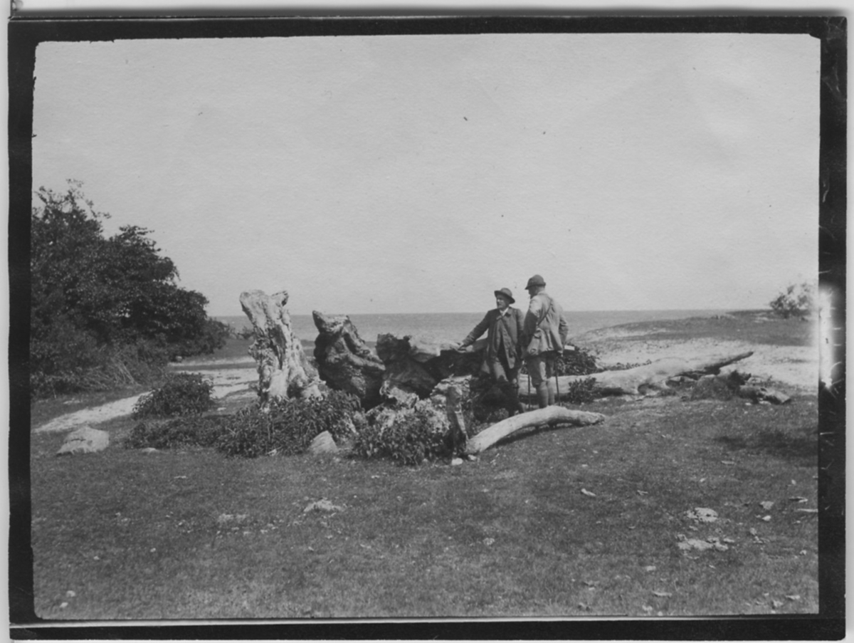 'Biologiska föreningens utfärd till Hallands Väderö: :: :: 2 män vid resterna av ett nedfallet, dött träd. I bakgrundne havet. Kläder. Klädsel. :: :: Se fotonr. 1464 och 4311:1-58 från samma utfärd.'