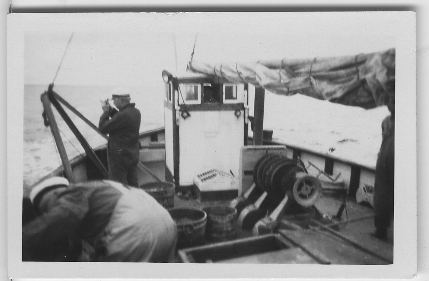 'Akkaexpedition, Bilder från Läsö och från båten (Skandia, FC51, FG51). :: :: 3 män synliga på båtdäck. Veven synlig. :: :: Ingår i serie 5089:1-63. Se även fotonr 2401-2453.'