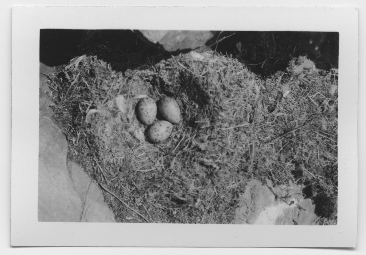 'Bo med 3 ägg av gråtrut. :: :: Text på baksidan av fotot: ''Bo med 3 st fullruvade ägg av gråtrut i en skreva mellan stora stenar högst uppe på Äggholmen. Kolonin bestod av ungefär 100 par.'' :: :: Ingår i serie med fotonr. 4544:1-35.'