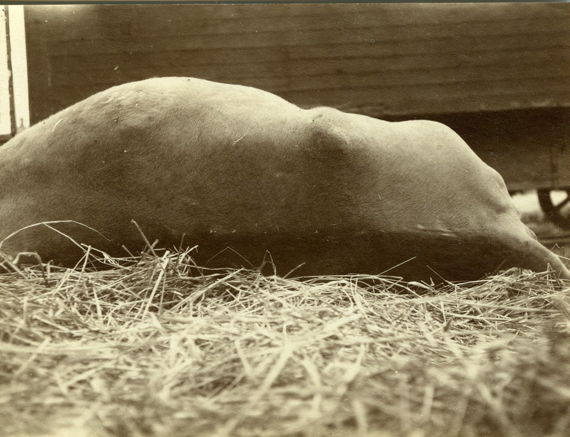 'Sabelantilop liggande i ''spilta''. Sedd från ryggsidan. Död i fångenskap på Cuneos menageri Göteborg 1910-08-19. Coll.an 4638 :: :: Finns utställd i däggdjurssalen, monterskåp 49. :: :: :: Ingår i serie med fotonr. 506-513.'