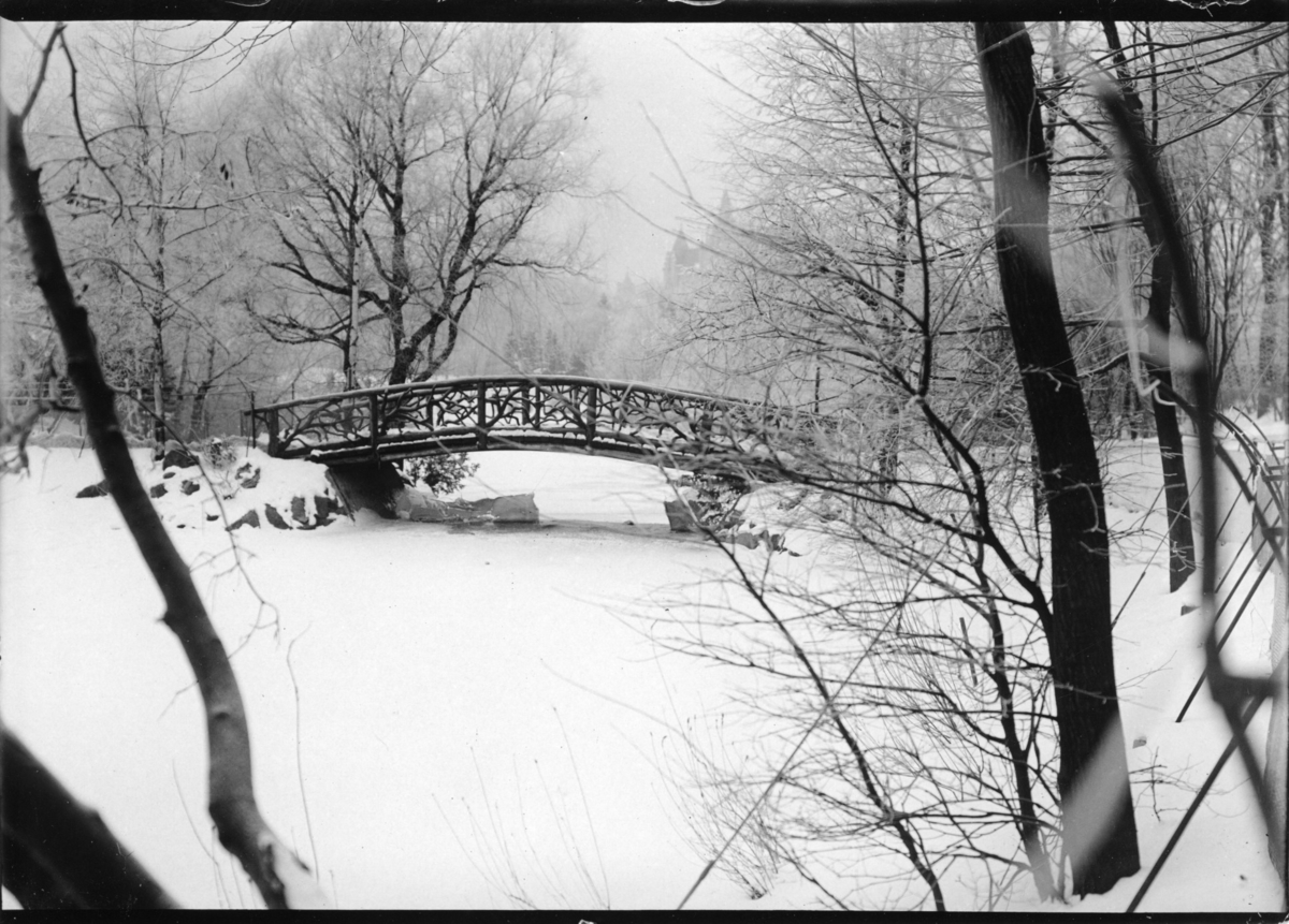 Vinterbild av fågeldamm med träbro. I bakgrunden skymtar kvarteret Slottsskogsledet vid Linnéplatsen. Vinterlandskap.