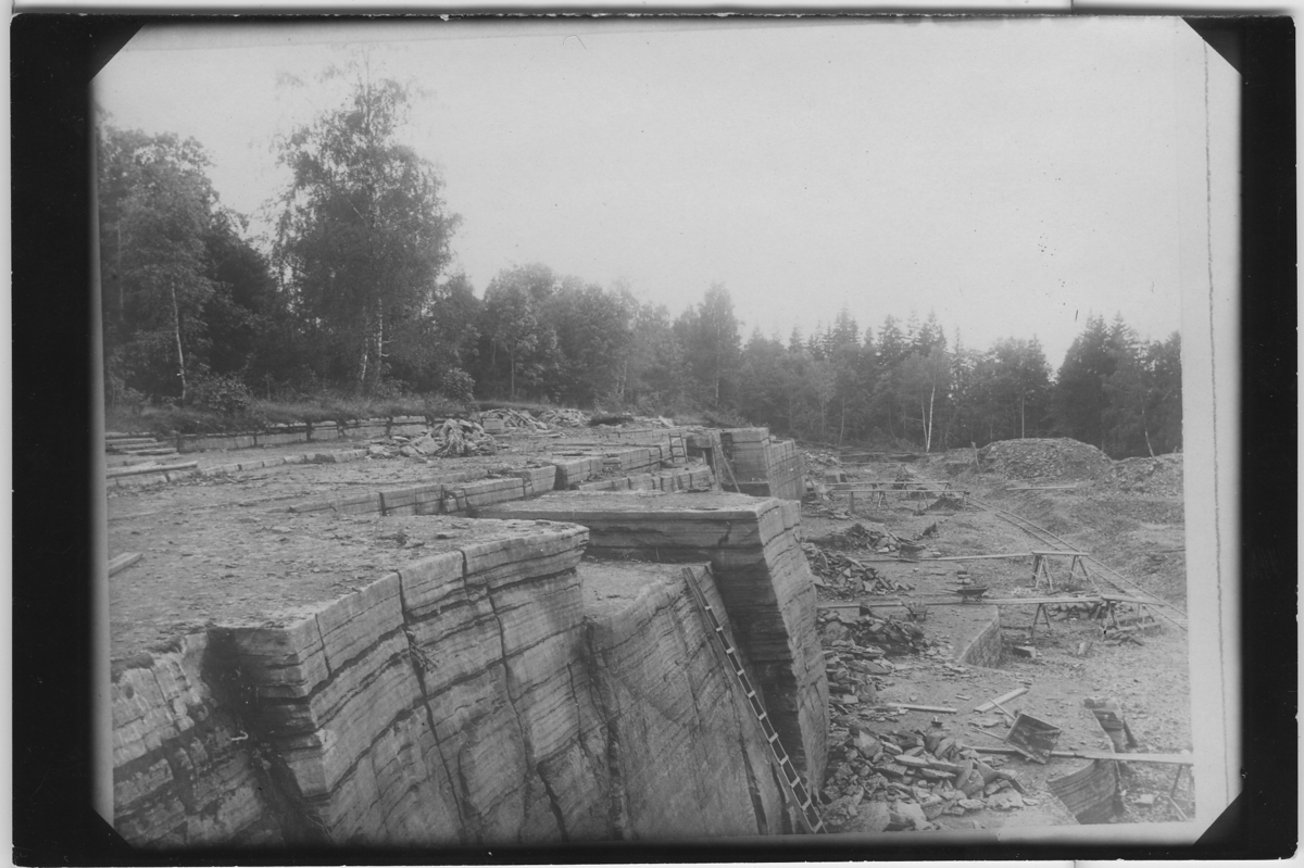 'Diverse foton från sannolikt Kinnekulle. Kalkbrott och naturliga skärningar. :: Vy över brottet där arbetet pågår. Pallbrytning. Dagbrott. :: :: Serie fotonr 4885-4901.'