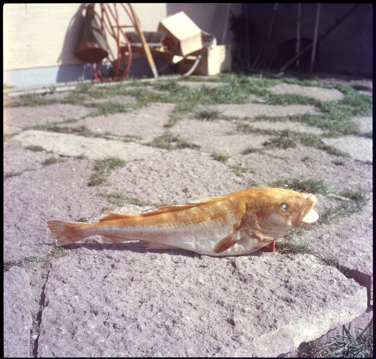 'Torsk, brandgul färgvaritet. Liggande på stenplattor, sedd från sidan. Fynddatum 1957-04-11. :: :: Ingår i serie med fotonr. 4676:1-6, se även fotonr. 4677:1-3.'