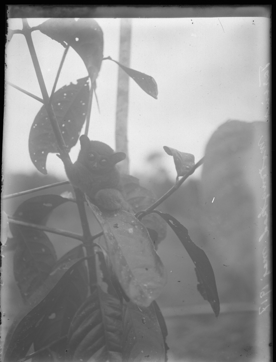 'Spökdjur sittande i träd (i fångenskap). :: :: Ingår i serie med fotonr. 5130:1-6. Se även fotonr. 1149.'