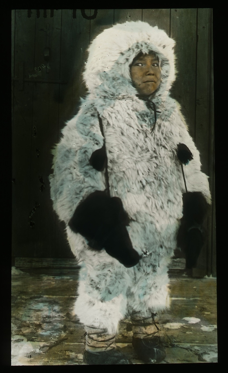 '1 barn, inuit (eskimå), klädd helt i päls. Text på på glaset: ''Eskimo child.'' :: Kläder. Klädsel. :: :: Ingår i serie med fotonr. 5203:1-22. Se även hela fotonr. 5202-5218 med bilder från Frits Johansen.'