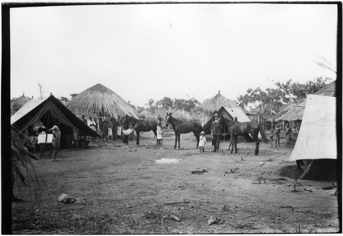 'Diverse fotografier från bl.a. dåvarande Nordrhodesia, nu Zambia, tagna av Konsul Magnus Leijer. :: :: 3 hästar framför tält och hyddor bestående av enbart tak. 3 st män håller varsin häst. Vid den ena hästen står 1 flicka. Omkring dem står , kvinnor och män.'