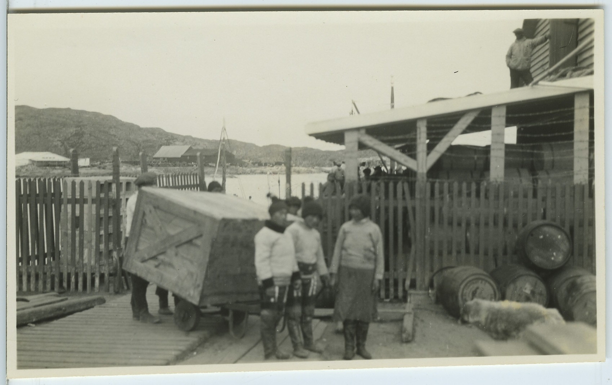 'Lossning av fartyget, båten, ''Hans Egedr'', vid Egedesmind. På bilden syns 6 inuiter (eskimåer) (enligt Frits Johnsens dagbok) dragande på en trälåda liggande på kärra. I bakgrunden byggnader, trätunnor. Kläder. Klädsel. :: :: :: Ingår i serie Fotonr. 5217:1-103. Se även hela fotonr. 5202-5218 med bilder från Frits Johansen.'