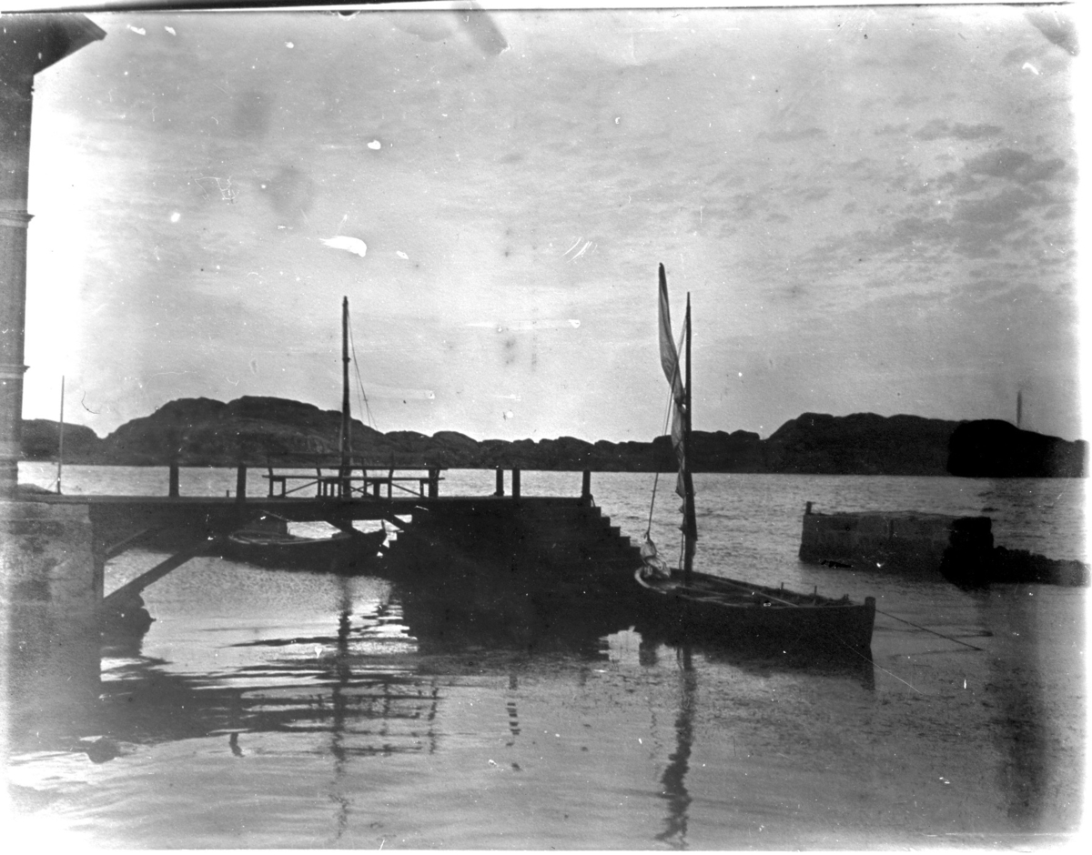 'Vy med båtbrygga i förgrunden. 2 båtar vid bryggan med trappa. Bryggan liggande intill byggnad. :: :: Ingår i serie med fotonr. 5137 med diverse bilder, en del ev. Kristineberg. Plåtarna ligger i 2 pappaskar. På asken för negativen 8x8 cm står texten: ''Kristineberg negativ samt negativ av havsdjur.'