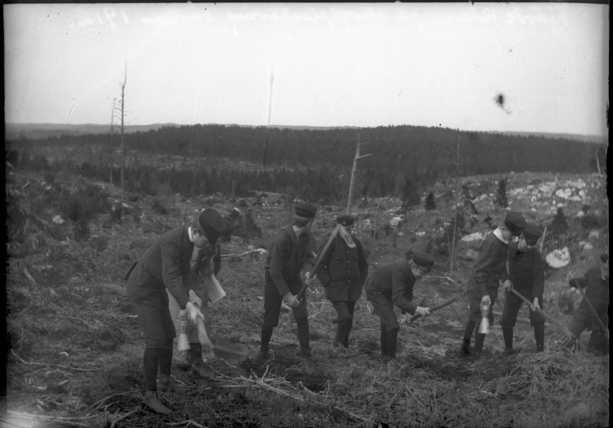 'Bildtext: ''Fjärde klass på skogsplantering, våren 1912.'' Vy över kalhygge med 7 pojkar och 1 flicka i grupp, arbete med skogsplantering. Iklädda kepsar, skärmmössor och arbetar med hackor och ev. planteringsjärn. :: :: Ingår i serie med fotonr. 5140:1-39.'