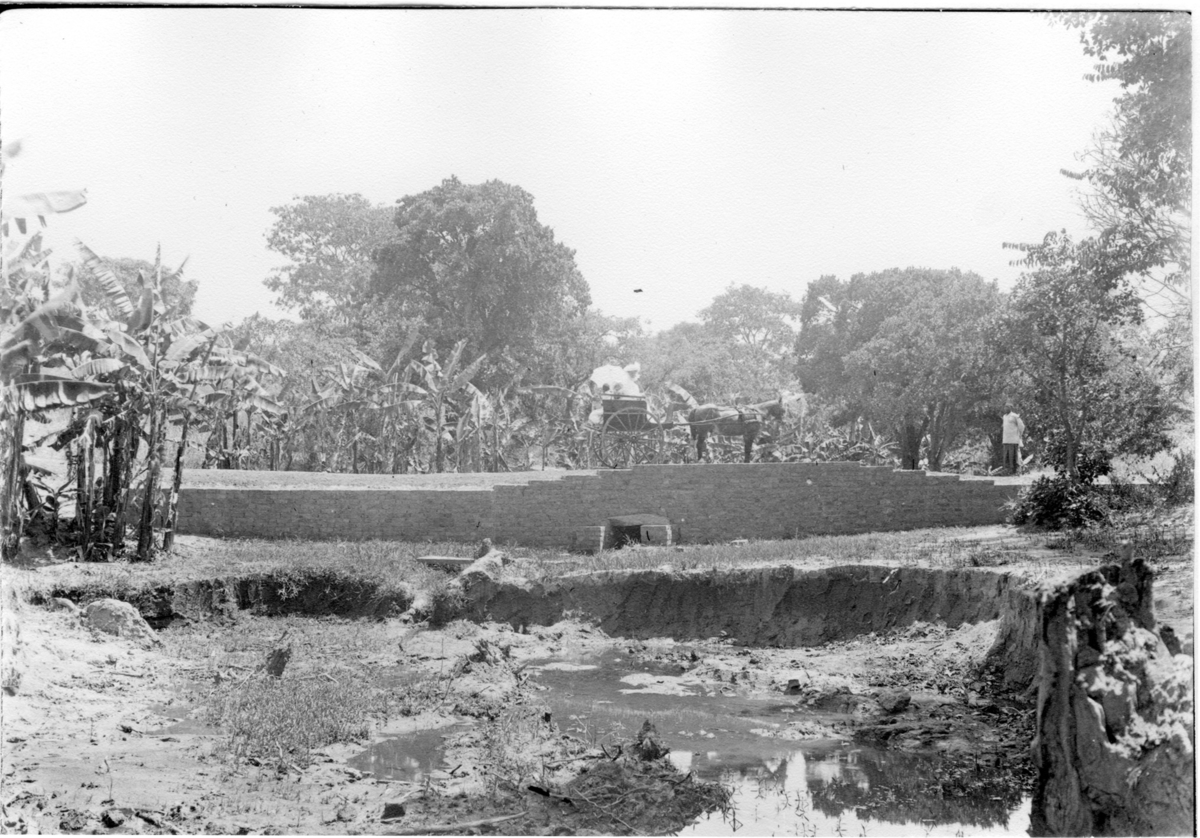 'Diverse fotografier från bl.a. dåvarande Nordrhodesia, nu Zambia, tagna av Konsul Magnus Leijer. :: :: 1 st kvinna, 1 st bebis och 1 st man sittande i vagn dragen av en häst. Ekipaget stående på en tegelmurad bro, i ena änden står 1 st man. Från avstånd.'