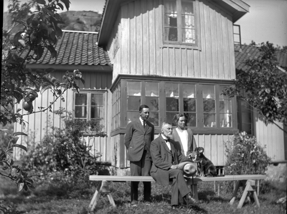 '2 män och 1 kvinna vid enkel träbänk i trädgård framför trähus. På bänken även en hund. Hatt. Kläder. :: :: Ingår i serie med fotonr. 5235:1-6.'