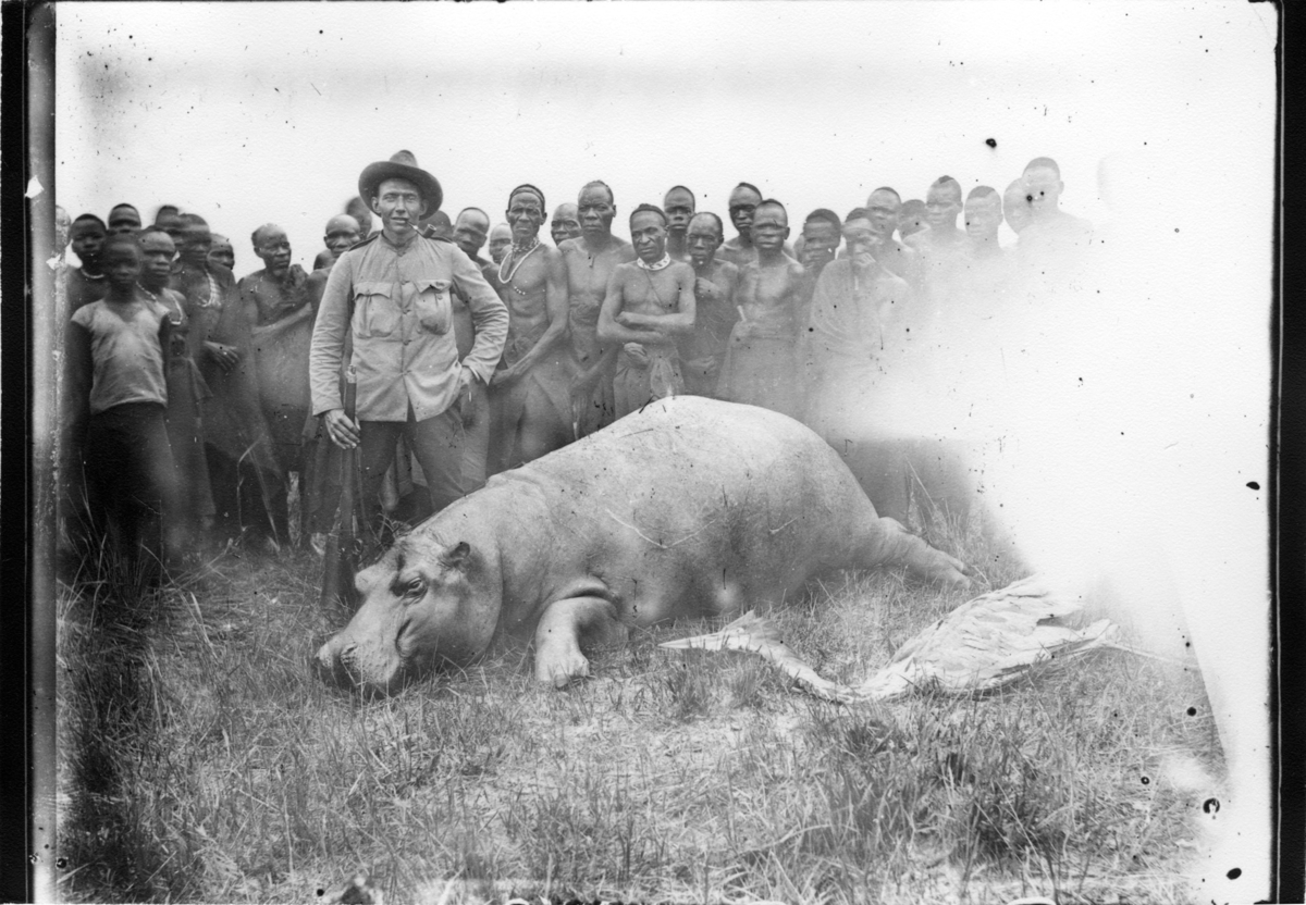'Diverse fotografier från bl.a. dåvarande Nordrhodesia, nu Zambia, tagna av Konsul Magnus Leijer. :: :: 1 st man stående bredvid en fälld flodhäst. Bakom honom står en rad män och barn.'