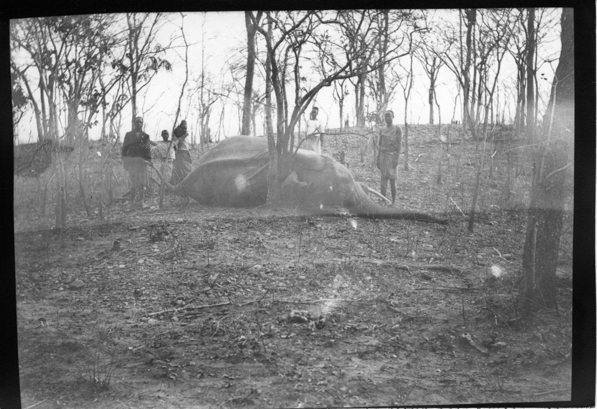 'Diverse fotografier från bl.a. dåvarande Nordrhodesia, nu Zambia, tagna av Konsul Magnus Leijer. :: :: Fem personer stående kring en fälld elefant liggande på marken bland träd. Samtliga vända mot kameran.'