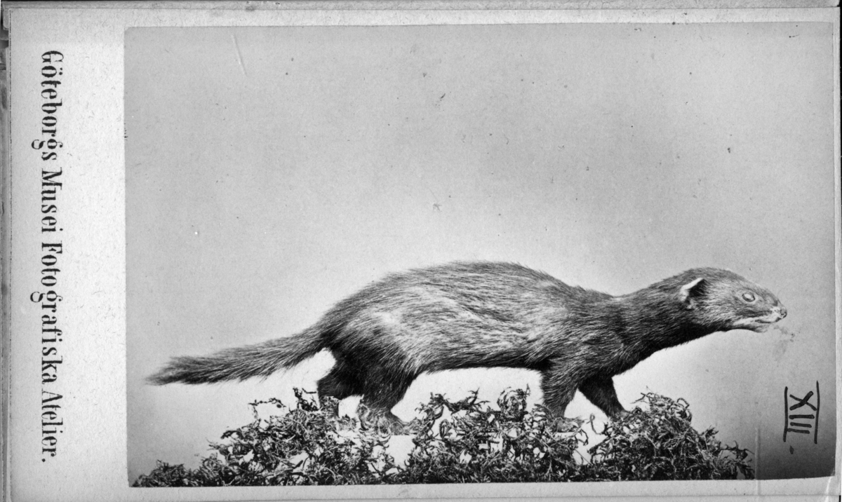 'Monterad iller, sedd från sidan. :: :: Text till bilden: ''Iller, som förekommer i södra och mellersta Sverige, sistas i allmänhet på marken och bor der uti jordhålor, stengärdsgårdar och dylikt. Han är djerf och roflysten och förorsakar ej obetydlig skada genom att förtära en mängd fogel och ägg, i synnerhet som han ofta uppsöker hönshusen och döda vida mer, än han för tillfället kan förtära. Grodor utgöra för honom en läckerhet, och han skall till och med insamla ett litet förråd af sådana småkräk.Illerns skinn lemnar ett godt pelsverk, och någon nytta gör han äfven genom att bortsnappa en mängd möss och sorkar.'' /August Wilhelm Malm år 1866. :: :: Serie med fotonr. 7079:1-37. Fotografierna är monterade i en liten bok, inbunden, med titel ''Fotografier öfer Däggdjur och foglar. Texter av A. W (1866). Malm. Boken återfinns i Göteborgs Naturhistoriska Museums bibliotekssamling under ''Äldretryck''. På baksidan av varje foto finns en text om arten. :: :: Se även fotonr. 5693:1-4.'