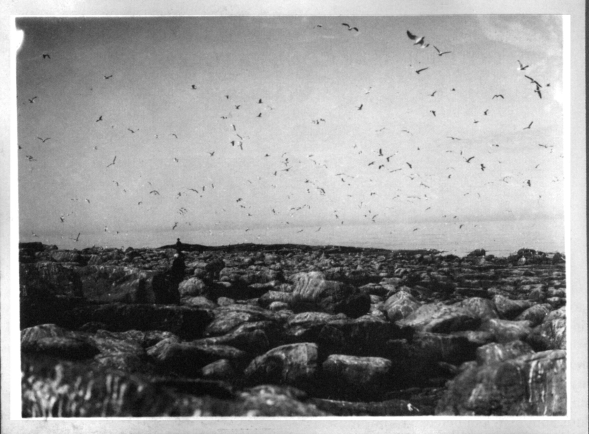 'Bildtext enligt Årstrycket 1999: ''Exkursionen till Tylön 6-7 juli 1925 dokumenterades av Bothén.'' Vy över hällar, ut mot havet med fågelmoln över hällarna. Några människor stående på hällarna. :: :: Ingår i serie med fotonr. 6765:1-39.'