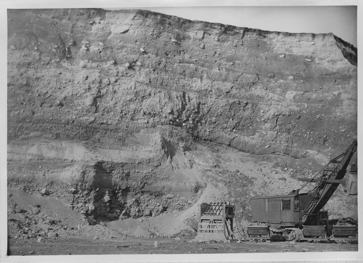 'Drösebacka grustag: Mitten av västra väggen i södra grustaget, där mammutbeten (gen.kat.nr. 31-5534) fanns, bilden har detaljer inritade. Grustaget med maskiner. :: :: Se fotonr. 2023-2027.'
