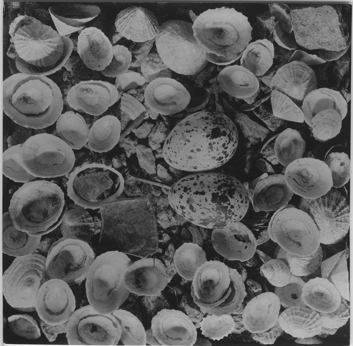 'Bo av sillgrissla med 2 st ägg med en ring av (mussel)skal och skräp (glasskärvor). :: :: Ingår i serie med fotonr. 3694-3719 se även fotonr. 3679-3693.'
