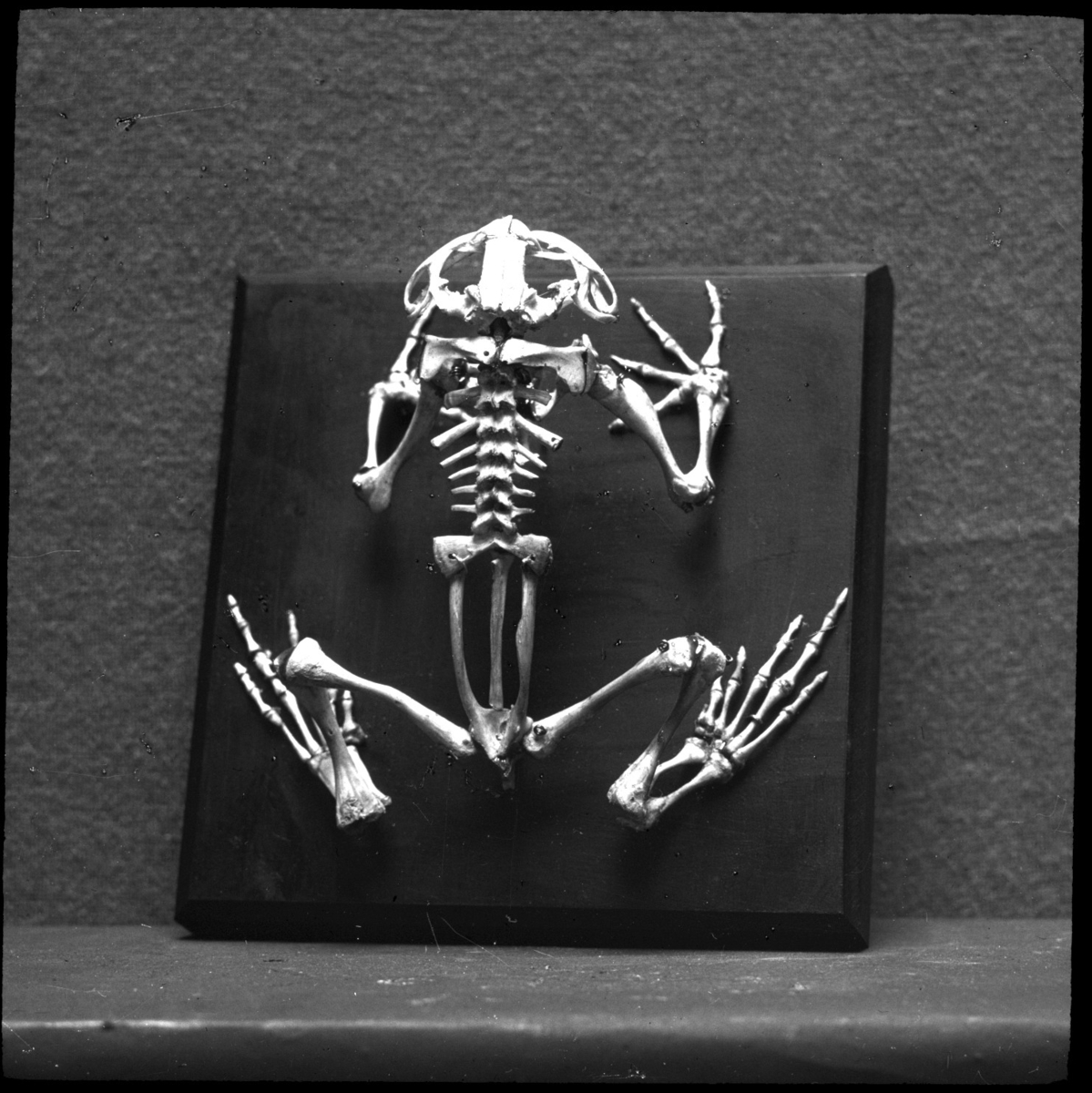 'Monterat skelett av agapadda, sett ovanifrån. :: :: Från Dr. Schlüter & Mass, Halle a S naturvetens. Läromedel. Numrerad I.C. Nr. 8. :: :: Ingår i serie med fotonr. 5374:1-30. Se även hela fotoserien 5374-5376.'