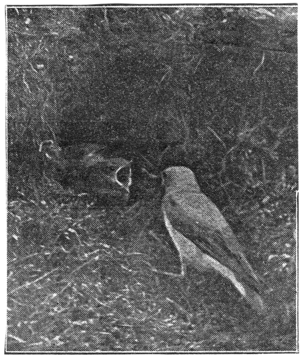 'Stenskvätta, hane med minst 2 ungar. Text på engelska under bilden i tidningsartikeln: En hane matar ungarna. :: Ur The Times Weekly Editition 1926. :: :: Ingår i serie med tidningsurklipp med fotonr. 1552-1563.'