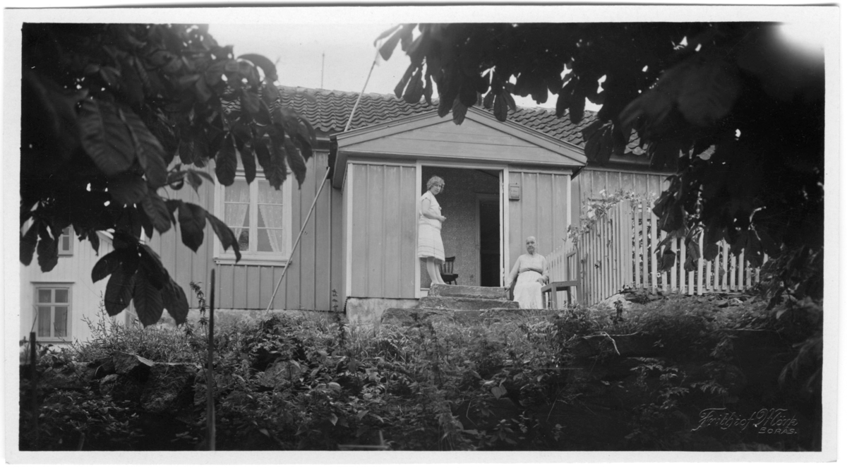 'Idyll vid gumman Albertina stuga. Yngre kvinna i ingången till farstun och 1 äldre kvinna sittande strax intill farstutrappan. I förgrunden bladverket av kastanjeträd. Stugan sedd framifrån. Långskaftad håv lutad på stugan. :: :: :: Serie fotonr 1888-1963.'