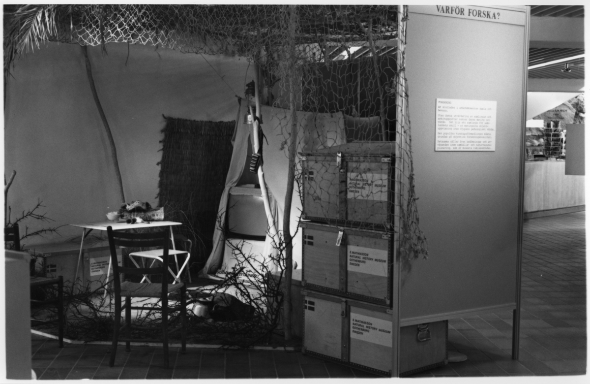 'Foto på Jubileumsutställningen, Göteborgs Naturhistoriska museum 150 år. :: :: Vy över, i utställningen uppbyggt, expeditionstält med tv-apparat, bord, stol, fotogenlampa, patronbälte, skinn av nilkrokodil samt fågel, våtpreparat av fisk samt fiskskelett från Sudan. Dessutom mindre vy over ytterligare delar av utställningen'
